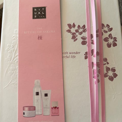 Rituals The Ritual of Karma hudpleiesett bestående av after sun, dusjgelé, fuktighetsgivende krem og en liten flaske med glitrende olje. Produktene har en blå farge og er designet for hudpleie etter soling og dusjing. Det følger med veske som er perfekt til å ha med på reise😊