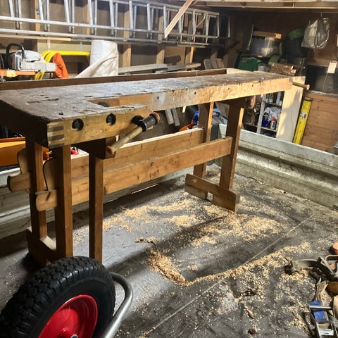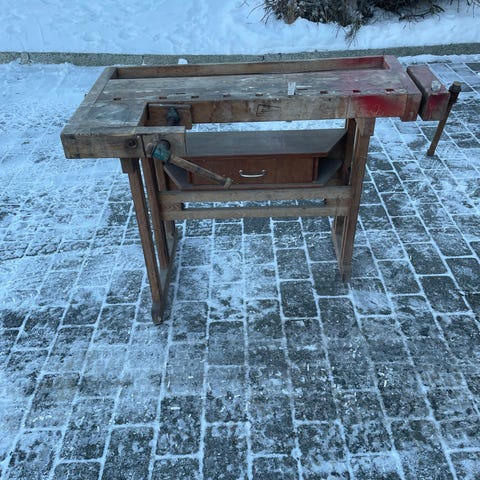 Arbeidsbenk i tre, designet for barn. Benken har en arbeidsflate med hull for verktøyoppbevaring og en bakplate med flere festemuligheter. Egnet for lek og læring av grunnleggende verktøybruk.