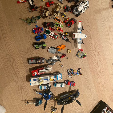 Diverse LEGO lekesett med ulike kjøretøy som brannbil, motorsykkel, racerbil, fly etc + en løve. Selges samlet som vist på bildene