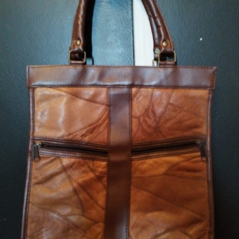 Mørkebrun med lås i stålfarge. Hel og fin inni.