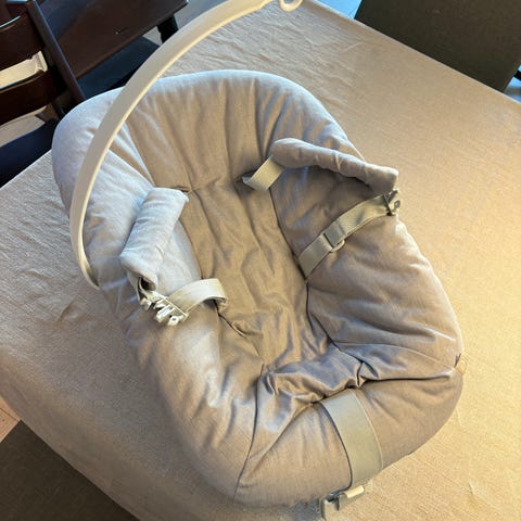 Helt ny ubrukt Stokke Tripp Trapp newborn sett i grå farge. Polstret sete med sikkerhetssele for nyfødte. Passer til bruk med Tripp Trapp-stolen for små barn.