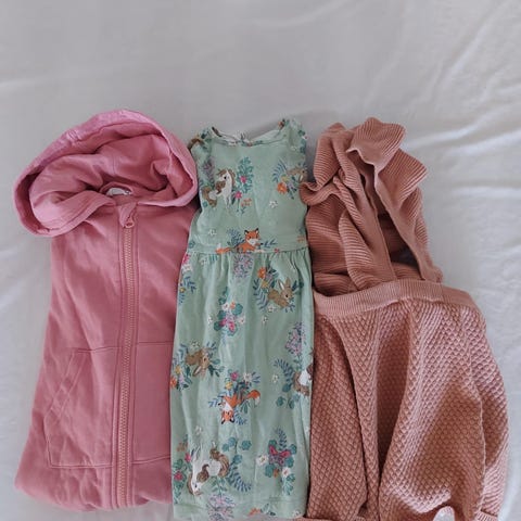 Denne klespakken er perfekt til barnehage, alt er i størrelse 98 - 98/104 bortsett fra den lilla buksa som er i størrelse 92.