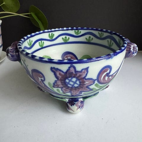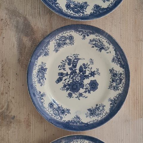 3 stk Blå fasan,i blå og hvit porselen med dekorative mønstre. Tallerkenen har en rund,dyp form og er egnet for servering av mat. Produsert ved Egersund Fayansefabrikk. Stempel 1963-1969.