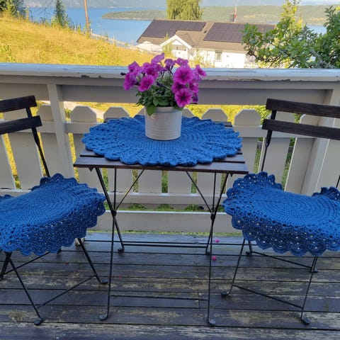 Håndlaget rund sittepute laget av ullfilt i flere farger. Putene har en spiralformet design med varierende fargekombinasjoner inkludert nyanser av gul, lilla, rosa, brun, grønn, blå og grå. Egnet for bruk som sitteunderlag. Sitteunderlagene er fine i bil på tur ute sommer som vinter. Silikon maling for antiskli. De er fingerheklet, og tovet.