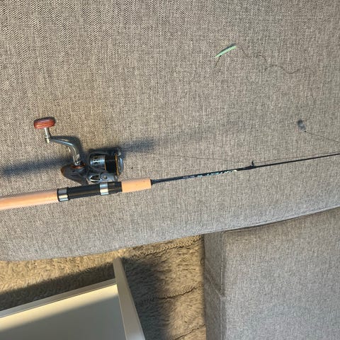 Stanga har handtak av kork og med innslag av gul og svart farge. Passer til isfiske.