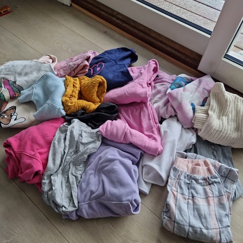 Selger en stor og variert klespakke til jente i størrelse 128–134.