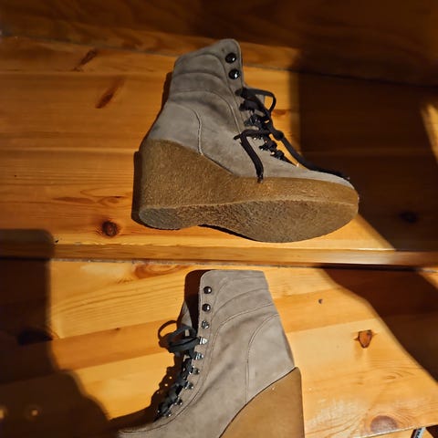 Litt slitt ved hælen inni, men med nye hæl / reparasjonslapper burde de funke fint 😊
