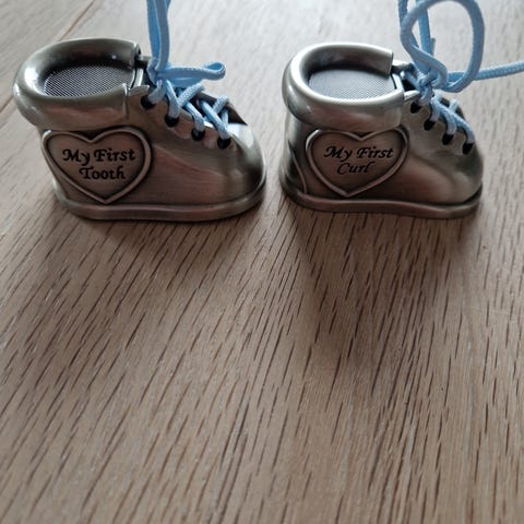 To sko til oppbevaring av første tann og hårlokk. Laget av tinn. Følger med blå og rosa lisser :)