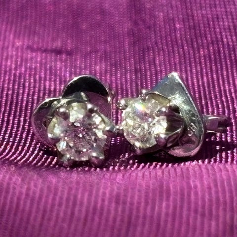 Helt nye øredobber med diamanter 0,3 carat (2x1,5) fra Gullfunn, kjøpt før jul 2025. Pris på butikken er ca. 15.000 kr. Øredobber selges med sertifikat fra Gullfunn.
