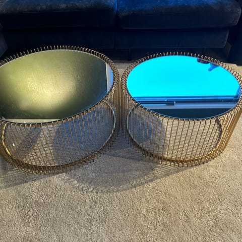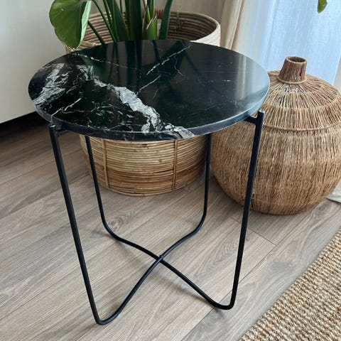 Det er noe merker etter lamper og lys som jeg ikke fikk bort med universal. Litt vanskelig å se grunnet gjenskinn, men de er der. Bordplaten er ekte marmor og kjøpte den på bohus en gang i tiden. Vagler litt ser jeg, men kan sikkert støttes opp av underlagsknotter. Den er ment for dekor og har tjent sin hensikt her i huset.