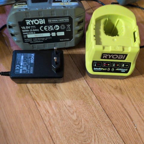 Ryobi 18V batteri og lader. Batteriet er kompatibelt med Ryobi 18V verktøy. Laderen har standard tilkobling for 230V strøm.