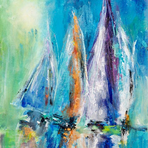 Håndcollorert kunsttrykk som forestiller seilbåter på sjøen. Trykket har en abstrakt stil med bruk av sterke og varierte farger, inkludert blått, hvitt, oransje og lilla. Motivet er fokusert på seilbåter med seil i bevegelse, og gir et inntrykk av dynamikk og sjøliv. Selges med eller uten ramme. Sender ikke i post. Kan avtale levering i Grenland evt hentes i Langesund.