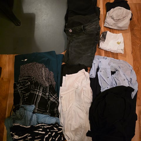 Selger flere sammensatte pakker med noen bukser, skjorter, gensere og treningsbukse eller tights i samtlige pakker.