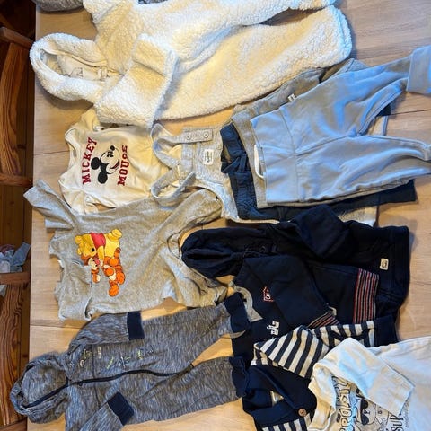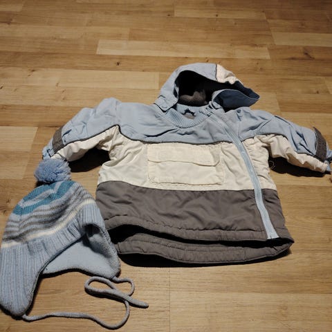Beige genser med lange armer og knapper foran (30 cm lang) bomull, grønn bukse med motiv og strikk i livet (40 cm lang) bomull/polyester, grønn jakke med hette og glidelås (32 cm lang) polyester. Str 6-9 mnd (68/74). Kjøpt i England og er fra merket George. Flott antrekk for de kalde vinterdagene som kommer.