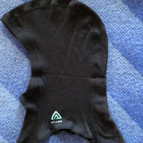 Lue med hals. Blå og rosa.