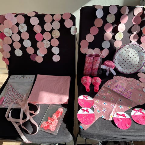 Selger en stor og gjennomført rosa baby shower-pakke med bamsetema – perfekt til baby shower, gender reveal eller feiring av «mom to be».