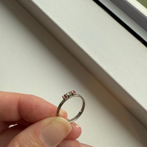Ringen ser ut til å være i en vintage- eller bohem-stil, og metallfinishen er sølvfarget.