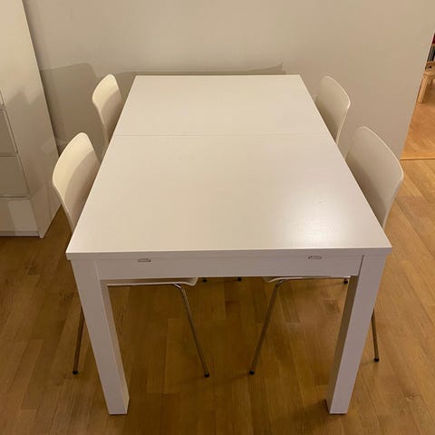 Bordet heter Bjursta (gått ut av produksjon) fra IKEA, er fleksibelt med to ileggsplater som oppbevares nedi bordet. Klaffer holder bordplatene sammen så overflaten er jevn og rett.