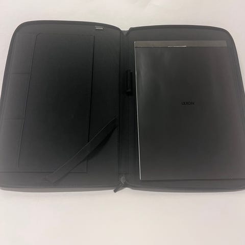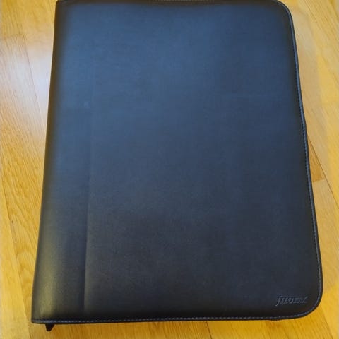 Grieg Plan Classic mappe laget av ekte skinn i svart farge. Inneholder ringpermer, flere lommer for kort og dokumenter, samt glidelåslomme. Egnet for organisering av dokumenter og kontorbruk.