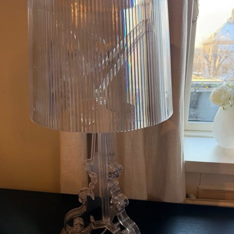 Kartell Bourgie bordlampe i fargen Crystal designet av Ferruccio Laviani. Lampen er laget i klar plast og har et klassisk barokk-inspirert design men med et moderne uttrykk.
