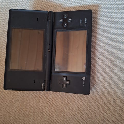 Nintendo DS XL bærbar spillkonsoll i blå farge. Konsollen har to skjermer og er kompatibel med Nintendo DS-spill. Inkluderer spillkassett for Super Mario.