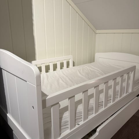 Juniorseng fra JLY med et stilrent design. Den har to paneler som hindrer barnet i å rulle ut av sengen og et praktisk lagringsområde under. Perfekt som barnets første seng etter at de har vokst ut av sengen.