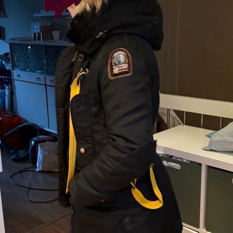 Parajumpers i størrelse XS, svart farge og laget av dun. Jakken er designet for kvinner og egner seg for kalde værforhold. Hetten har glidelås og kan derfor tas av.