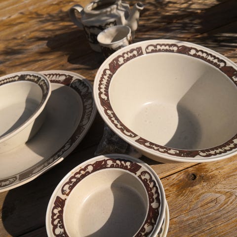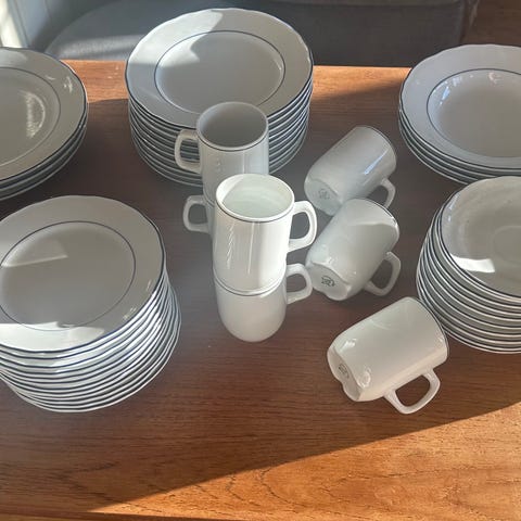 2 skåler og 3 asjetter i samme mønster pluss 3 kopper med litt annet mønster ( nyere utgave), men som fint kan brukes sammen.