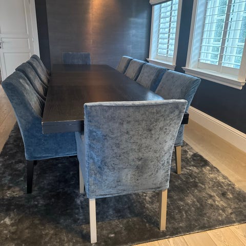 Vi flytter og må desverre selge spisestuemøbler (utrekkbart bord, 10 stoler og lampe). Lignende lampe og stoler selges på Slettvoll til langt dyrere pris. Stolene er veldig komfortable og har trekk som kan tas av og vaskes. Original trekk har skader, men nye trekk ble sydd i 2025 av møbeltapetserer. Her kan du få en hel spisestue til en god pris. Foretrekker å selge alt samlet, men det er også mulig å kjøpe hver for seg