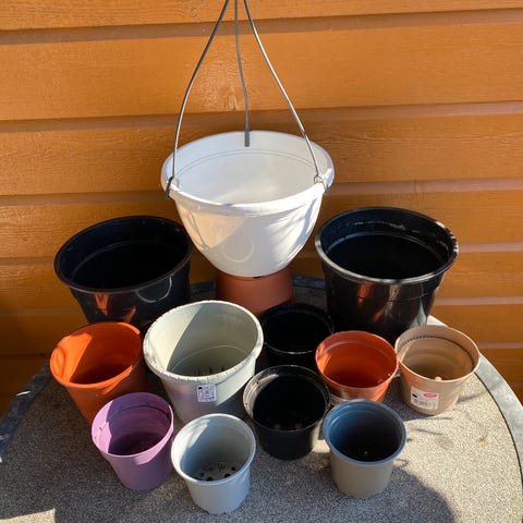 Potter i flere størrelser og farger. Pottene er laget av plast og egner seg til bruk for planter og hagearbeid.