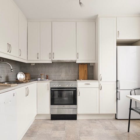 Kjøkken med hvite skap og integrerte hvitevarer