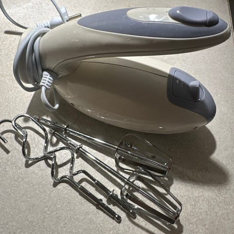 Elektrisk Håndmikser i hvit farge. Utstyrt med to visper og enkel betjening med skyveknapp for hastighetsinnstilling. Egnet for blanding og visping av ingredienser i kjøkkenet.