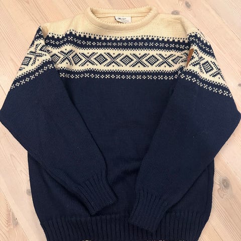 Genser fra Lillehammer OL ‘94 i størrelse M/L. Jeg er 183cm og den har passet fint til meg. Om du er litt kortere vil den bare gi en enda tydeligere 90-tallsform, som er bra. Noen små, svake flekker som kan sees på bildene. Har ikke turt å vaske den for hardt for å bevare trykket.