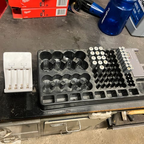 Oppladbare batterier, kjøpt på Class Olson for 4 år siden. Et par batterier som har mistet litt effekt, ellers funker det perfekt.