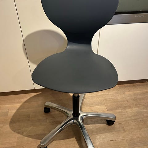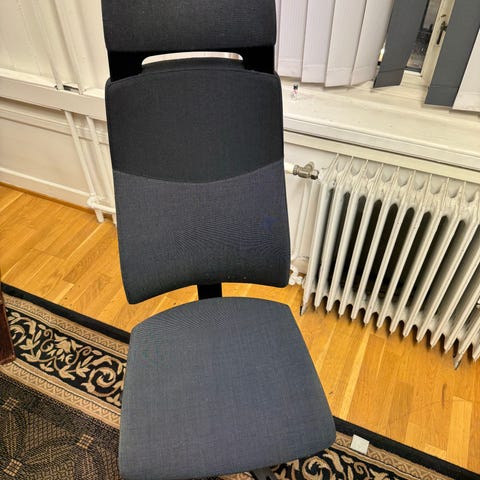 Kontorstol i svart materiale med armlener og hjul for enkel bevegelse. Justerbar høyde for tilpasning til brukerens behov. Passer til kontor- eller hjemmearbeidsplass.