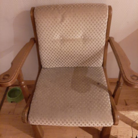 To solide trestolar i svart og tre gis bort mot henting. Dei er godt brukt, so litt av det svarte har begyndt å skalle vekk på ryggstøtta. Og særlig den eine har malingsflekkar på setet. Trur det går fint å pusse/skrape det vekk.