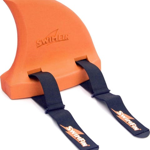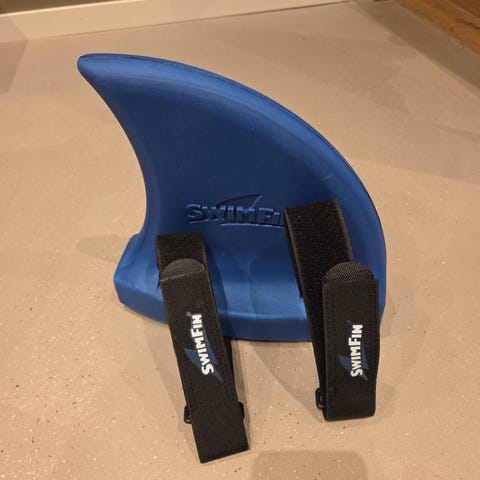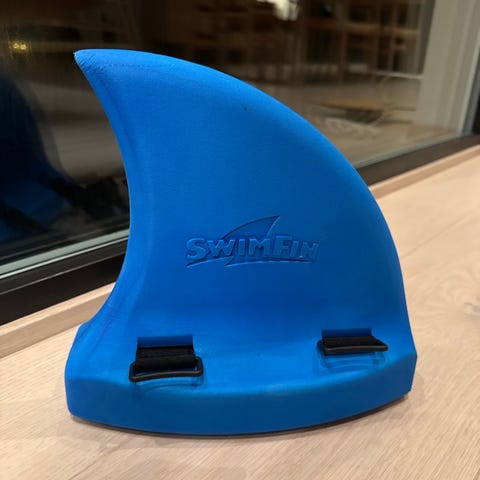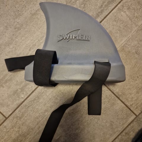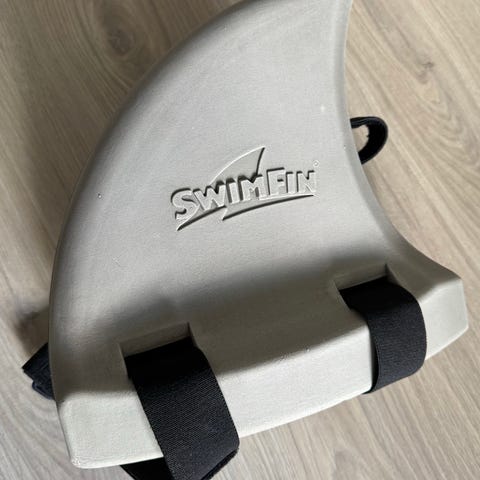 SwimFin svømmehjelpemiddel designet for barn med vekt mellom 15 og 30 kg. Produktet er grått og laget av holdbart materiale. Brukes under konstant tilsyn og er ment for å hjelpe barn med svømming.