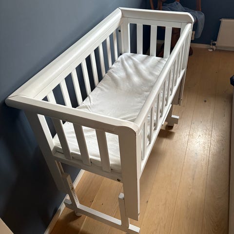 Selger en Troll bedside crib. Eldre modell og noe slitt i malingen, selges derfor billig. Kan reguleres opp og ned og har hjul.