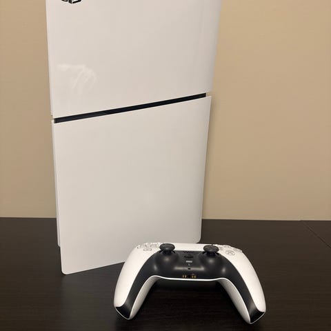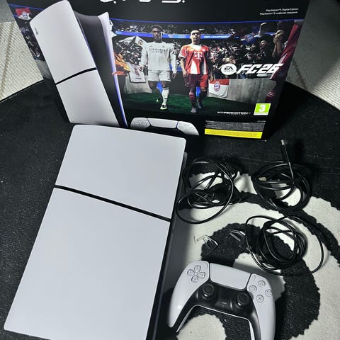 Playstation 5 spillkonsoll med hvitt og svart design. Konsollen leveres med en trådløs kontroller. Egnet for bruk med moderne spill og multimediaapplikasjoner.