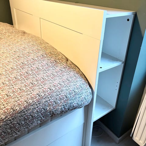 Du trenger ikke et nattbord når du har oppbevaringsplass i hodegavlen. Dette sparer plass og gjør det enklere å komme til bokser eller skuffer under senga. Det blir enklere å støvsuge også.