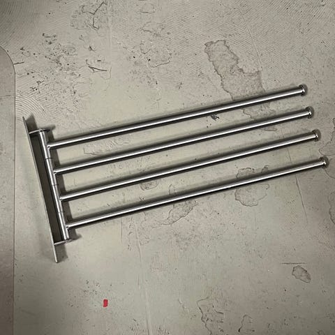 Stumtjener i krom med flere armer for oppheng av klær og tilbehør. Designet for å stå på gulvet med en stabil rund base. Passer til oppbevaring av håndklær, skjerf og andre plagg.