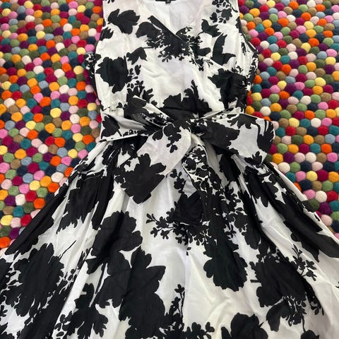 Ricco vero kjole i str S. Materialer er viskose, nylon, lammeull, bomull, angora, kashmir og silke (se bilde av lappen). Dekorativt overstykke. Kjolen er ca 89 cm fra skulderen og rekker til midt på låret på meg som er 172 høy.