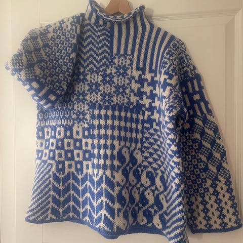 Nordic Mix Sweater designet av Laura Dalgaard, er en Boxy sweater med patchwork av tradisjonelle nordiske mønstre. Genseren er strikket med Fivel, et 2-tråds kardegarn, spunnet av de fineste fibre fra norske lam. Dette er et av våre mykeste norske ullgarn, som blir enda mykere etter vask.Siden Fivel er såpass lett spunnet vil plaggene kunne nuppe over tid. Denne overulla kan enkelt tas bort med en nuppefjerner og plagget vil holde seg fint fremover.