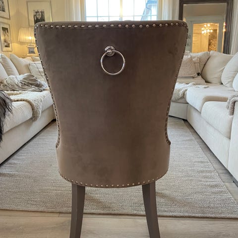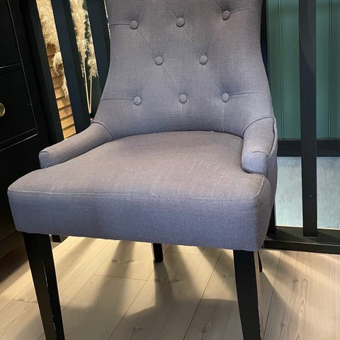 Selger 6 komfortable og stilrene spisestoler i grått stoff. Stolene er i veldig god stand, robuste, godt vedlikeholdt og fremstår som lite brukt. Klassisk design med knappet rygg, samt dekorativ og praktisk ring på baksiden gir et eksklusivt preg. De er veldig gode å sitte i og har en neutral farge som passer de fleste hjem