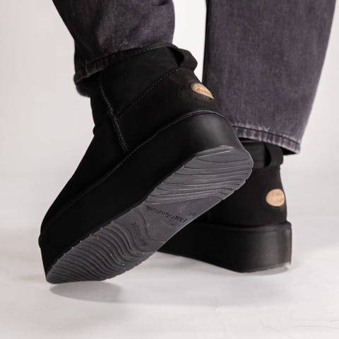 "Blurred er en trendy vinterstøvel som kombinerer mote og funksjon. Den er laget av vannavstøtende saueskinn og har en vanntett gummikant nederst på skoen som gir beskyttelse mot sølepytter og slaps. Det australske saueskinnsfôret gir ultimat varme og transporterer naturlig bort fuktighet. Den røffe yttersålen i gummi gir ekstra grep. "