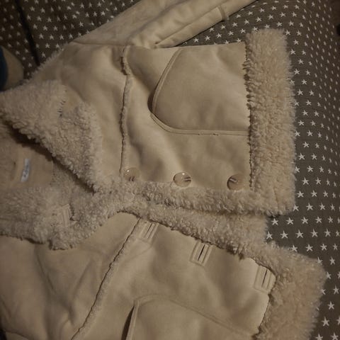 Jakken er beige og laget av fuskepels. Den har en myk og varm tekstur, egnet for kaldere vær.