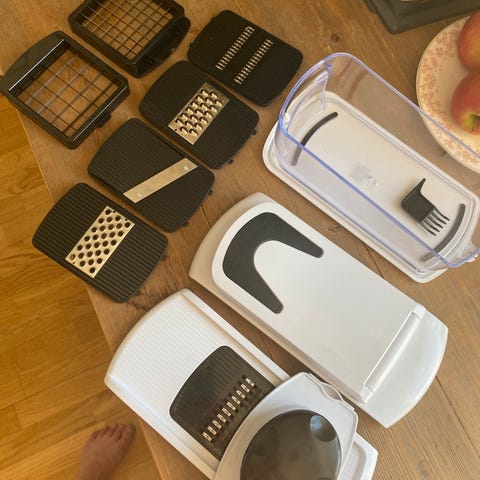 Mandolinjern med flere utskiftbare blader for skjæring i ulike tykkelser. Laget av svart plast og rustfritt stål. Egnet for presis kutting av grønnsaker og andre matvarer.