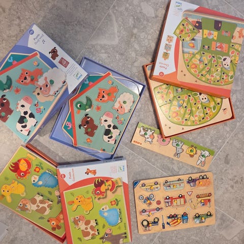 Djeco trepuslespill for barn med dyremotiv. Inneholder to puslespill med fargerike dyr som løve, krokodille, elefant, apekatt, papegøye, sjiraff og flodhest. Puslespillene har håndtak for enkel håndtering og er laget for små barn. Det ene puslespillet har lyd, men den er lit halvveis (må kanskje skifte batteri)