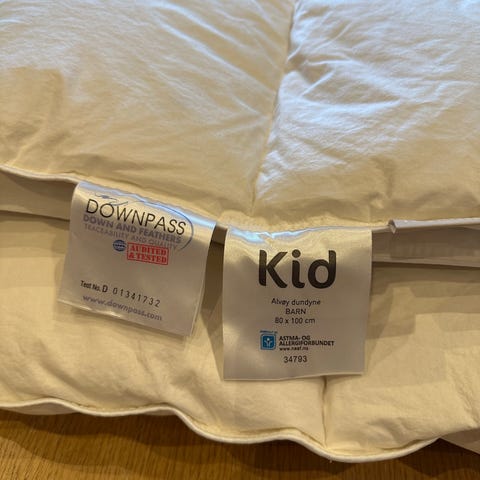 Jeg har feil pose til dynen, men se bilder av lappene på dynene for å se andel dun osv.