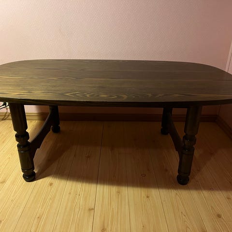 Bordet er stødig og i god strukturell stand. Som bildene viser, har bordplaten noen bruksmerker og vannmerker/skjolder i overflaten. For en som er litt hendig, vil dette bli som nytt med en lett puss og litt olje.